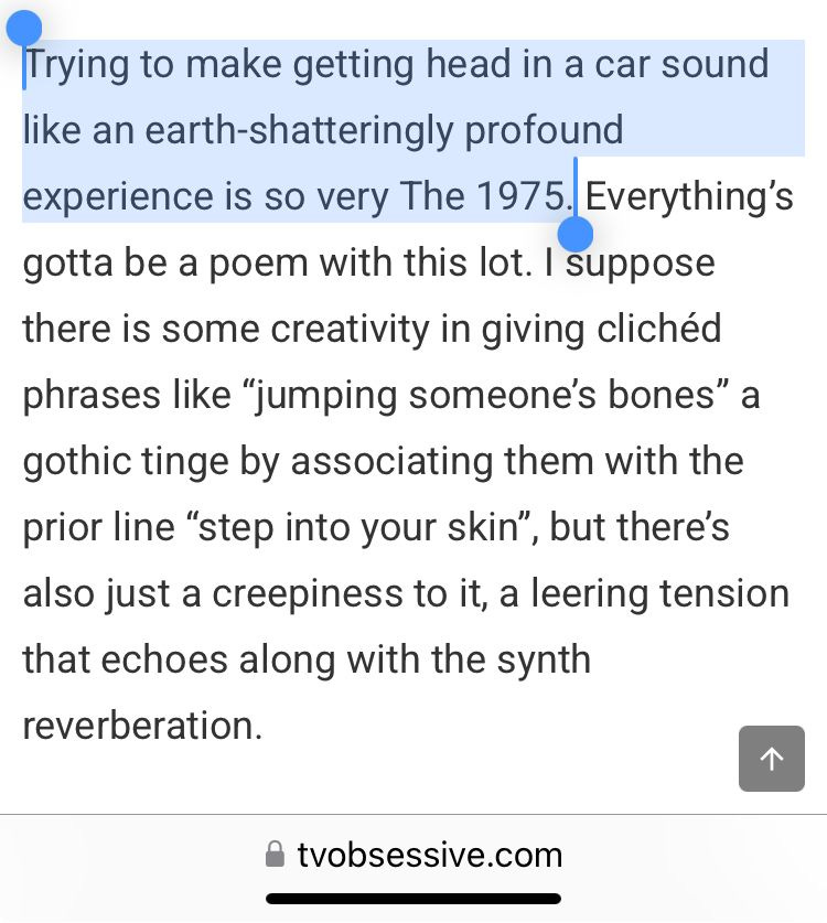 sitting in our rooms with the same 15 saved tiktoks of matty chain-smoking in berlin, the same playlist titled “i swear this means something,” the same screenshot of that tweet that said “the 1975 sounds like falling in love with someone who’s about to ruin your life.”